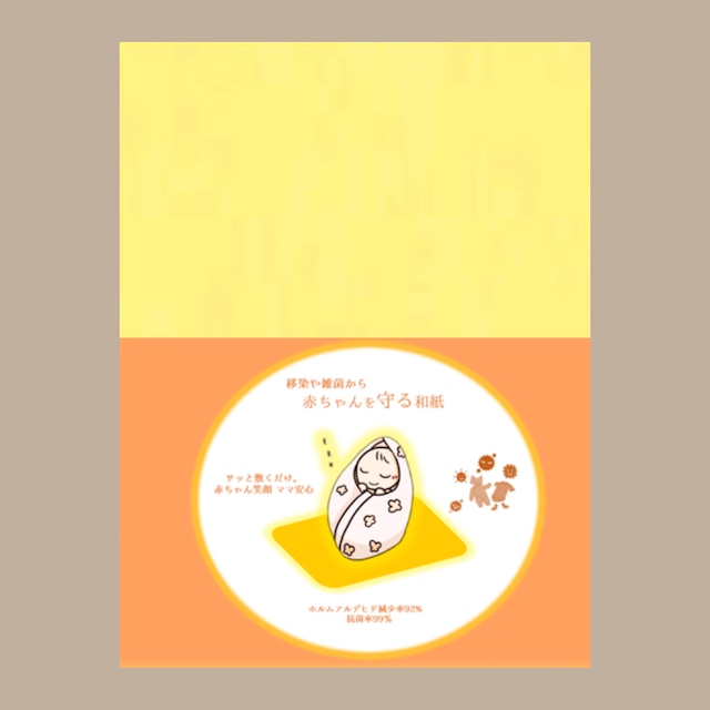 ホルムアルデヒドは赤ちゃんにとって有害な物質です。 ベビー服などから検出されることが禁止されています。 しかしながら、他の様々な製品に含まれるホルムアルデヒドがベビー服に移る(移染)ことがあります。 移染を受けたベビー服を赤ちゃんが着ると、皮膚の炎症やアレルギーをひき起こすことがあります。 赤ちゃんを守る和紙は、サッと敷くだけで、ホルムアルデヒドを除去!! 薬品を使用しない天然素材の効果で赤ちゃんも安心 !! その他にも黄色ブドウ球菌・大腸菌・肺炎桿菌・モラクセラ菌など 身近な雑菌を抗菌、汗や湿気、嫌な臭いまで吸着します。 しかも使い捨てではありません。 天日に干すことで機能再生!!繰り返し使えます。